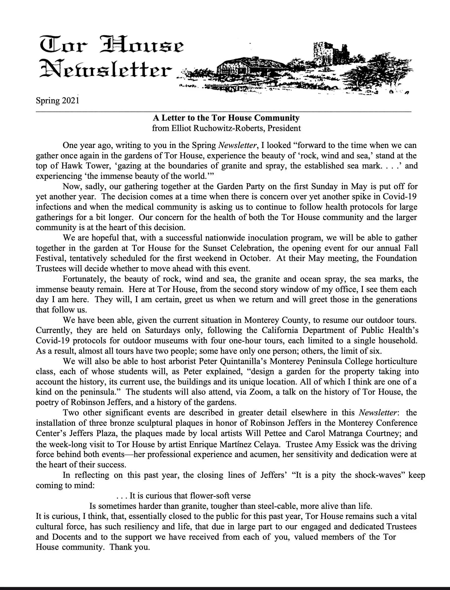 Tor House Foundation Newsletter Spring 2021 Apr 10 Written By Click here or on image below to download the PDF of the Spring 2021 newsletter