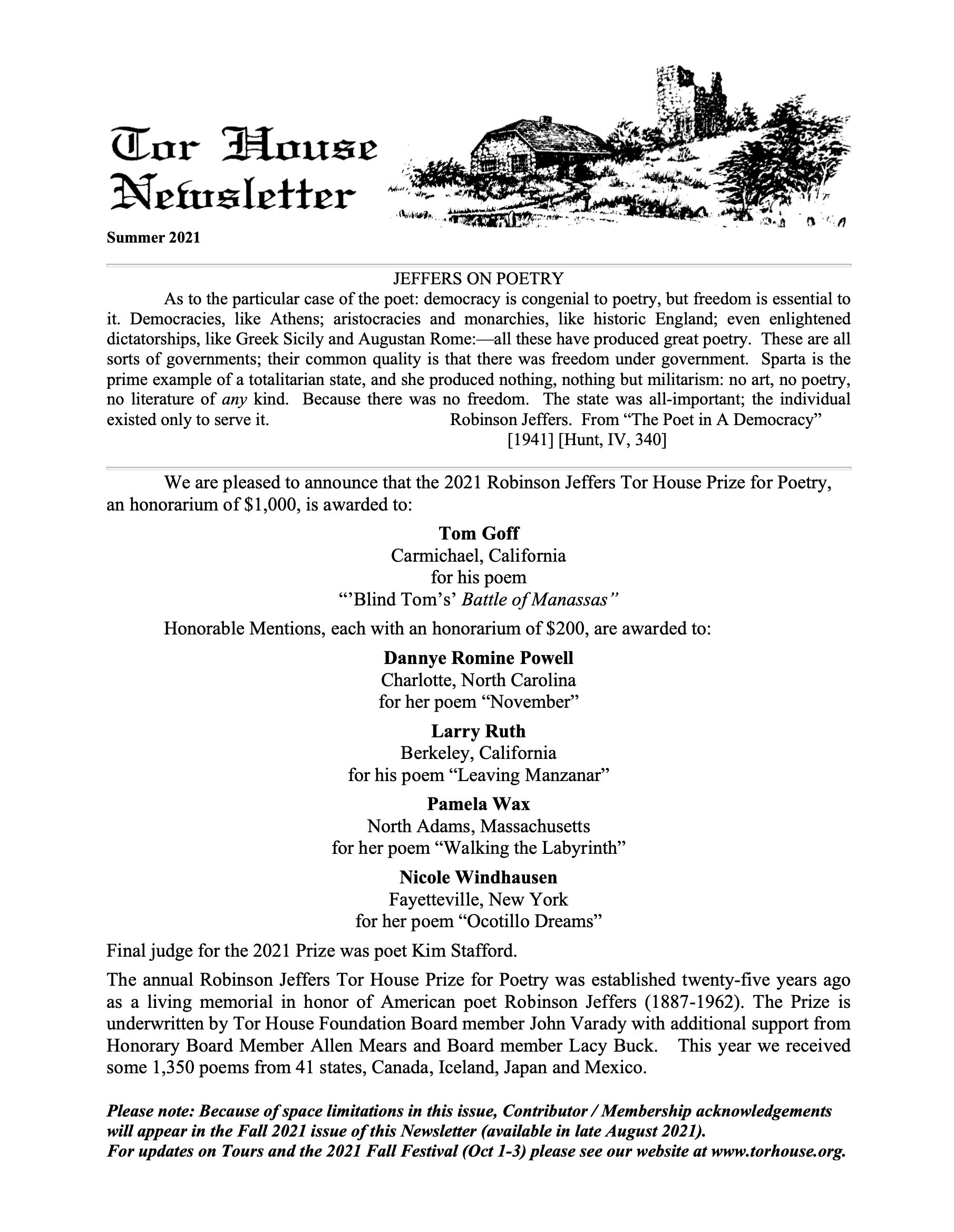 Tor House Foundation Newsletter Summer 2021 Jun 24 Written By Click here or on the image below to download the PDF of the Summer Newsletter and Winners of the Prize for Poetry.
