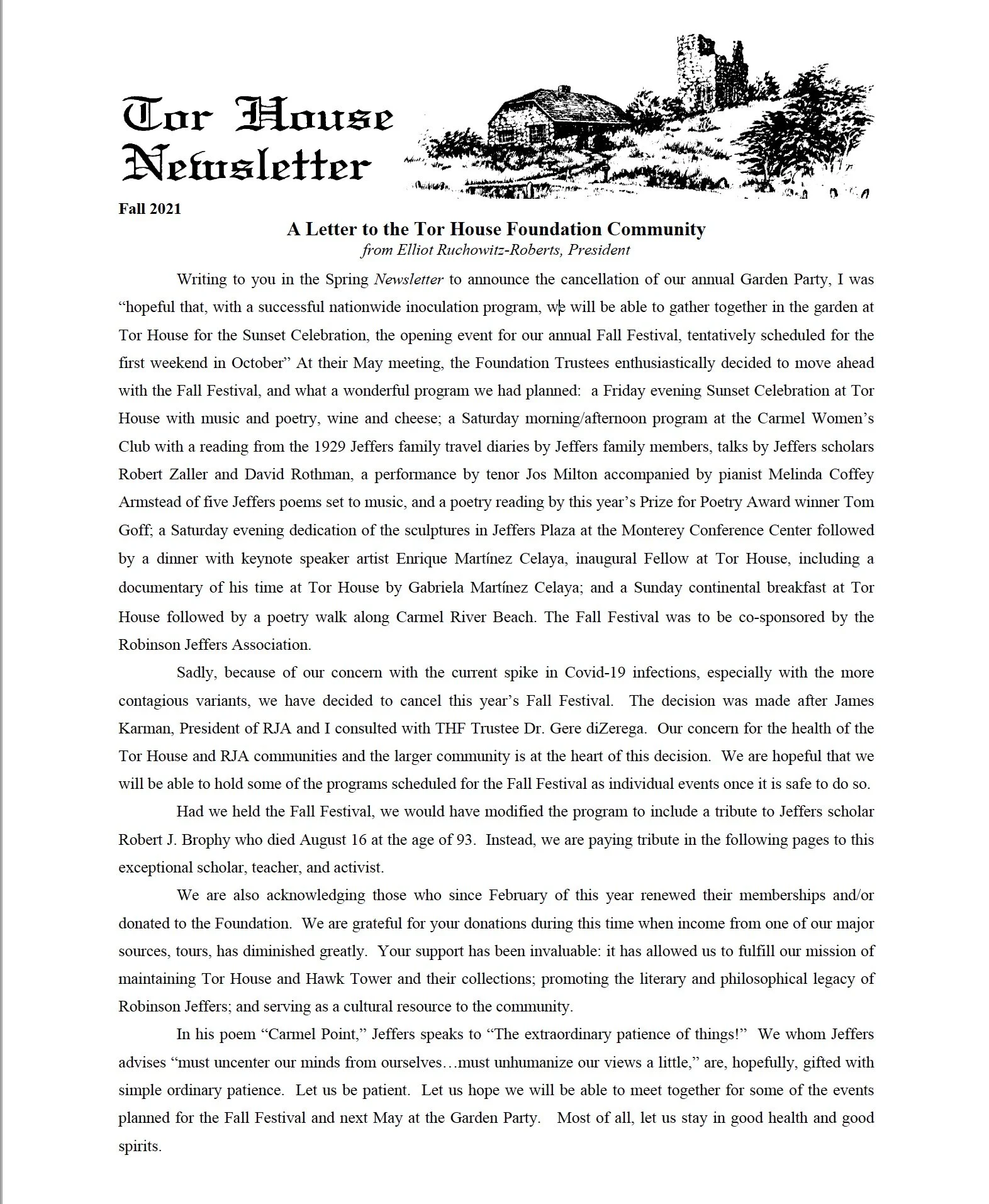 Tor House Foundation Newsletter Fall 2021 Sep 8 Written By Click here or on the image below to view the online Tor House Foundation Newsletter for Fall 2021