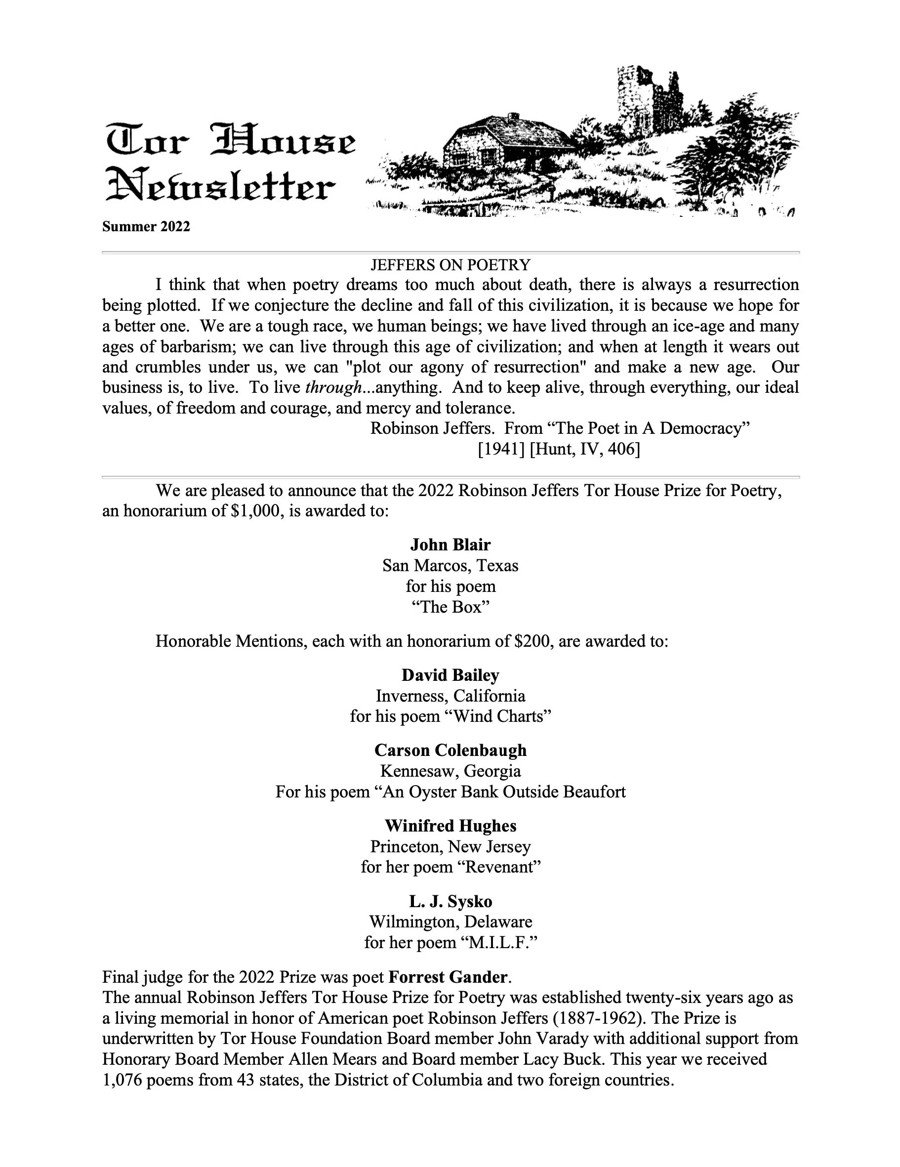 Tor House Summer 2022 Newsletter Jun 18 Written By Click here or on image below to view PDF of the Summer Newsletter from the Tor House Foundation