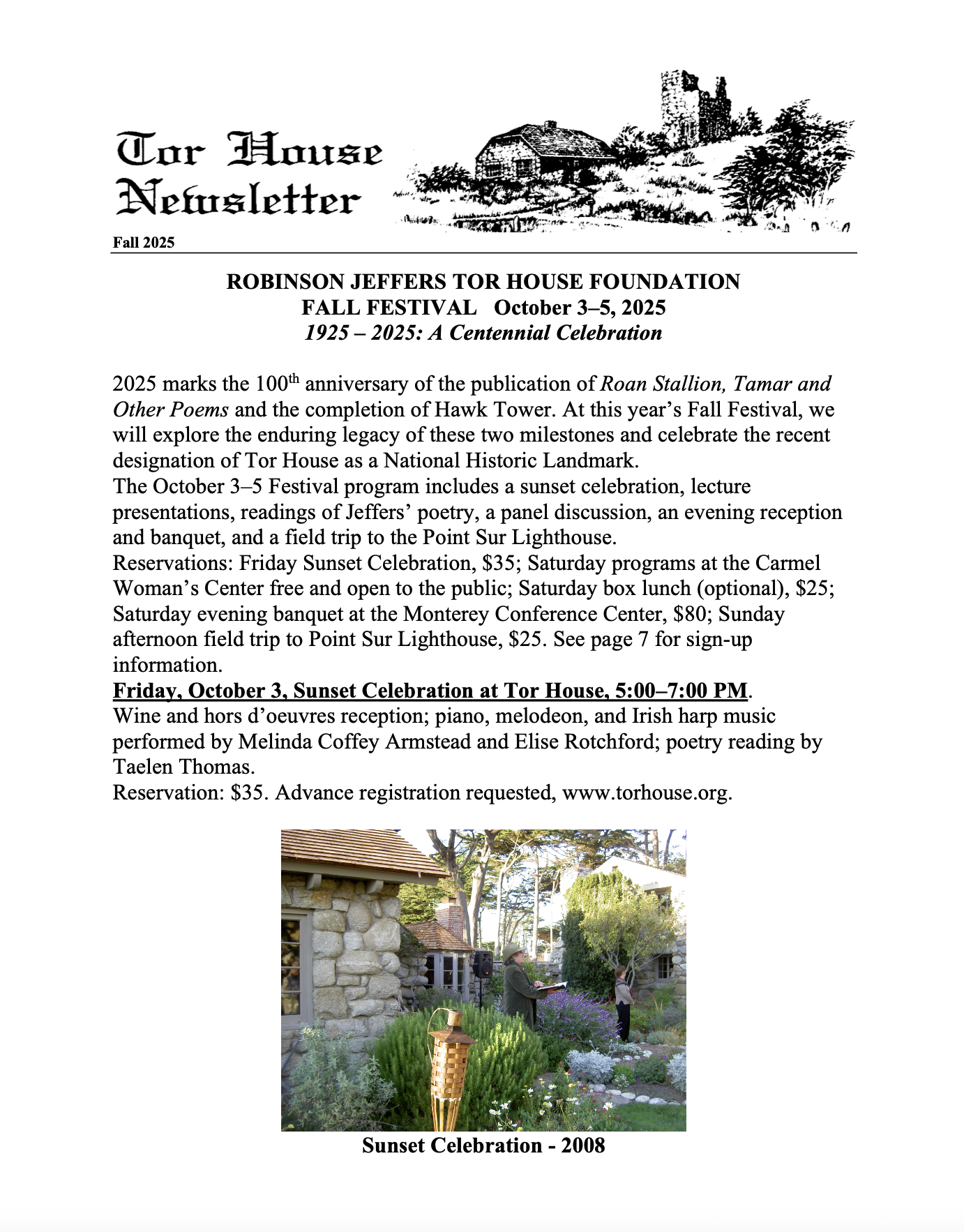 Tor House Foundation Autumn 2025 Newsletter Sep 2 Written By Click here to view and download the Autumn 2025 Newsletter with details on our upcoming Fall Festival.